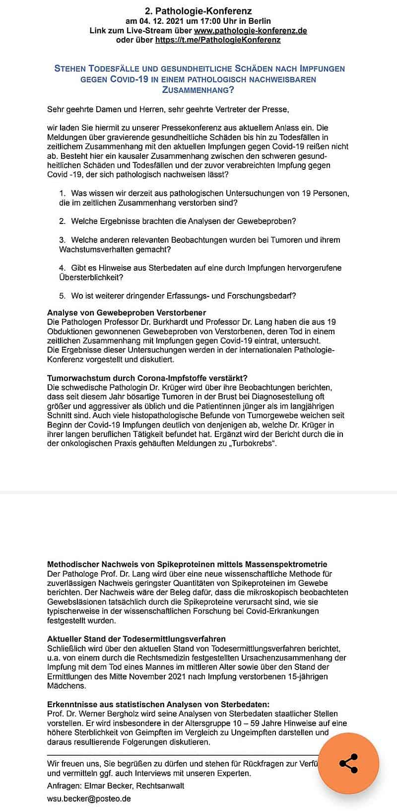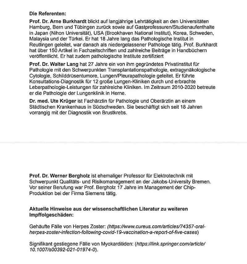 Am 20. September fand die 1. Pathologie Konferenz statt und förderte das Ergebnis der Analyse von COVID-19-Impfstoffproben zu Tage, das sich mit den Erkenntnissen von Wissenschaftlern aus Japan und den USA deckt. Es haben sich im Impfstoff undeklarierte metallhaltige Bestandteile feststellen lassen. Optisch fallen Impfstoffelemente durch ihre ungewöhnliche Form auf. Bei mehr als 40 obduzierten Leichen, die binnen zwei Wochen nach der COVID-19-Impfung gestorben sind, zeigte sich ganz klar, dass circa ein Drittel kausal an der Impfung verstorben sind.