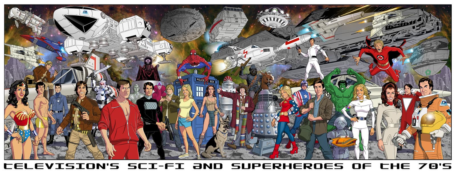dusty-abell hat diese geniale Illustration mit so ziemlich allen SciFi-TV-Helden aus den 70er-Jahre-Serien gemalt. Von Battlestar Galactica bis zum Hulk sind alle dabei, ja sogar Bobby Ewing als Mann aus dem Meer…