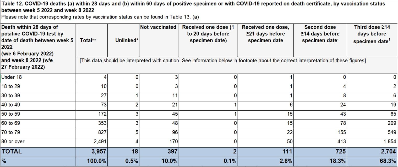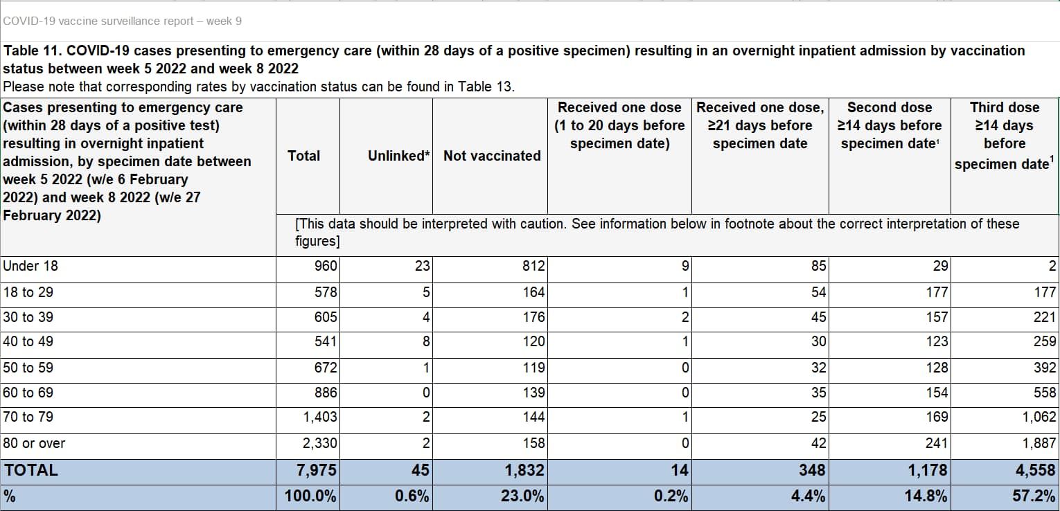 Die realen Zahlen sprechen leider eine andere Sprache: 77 % der COVID-19-Krankenhauseinweisungen im letzten Monat in England waren geimpft, darunter 4’558 Personen, die gerade ihre Auffrischungsimpfung erhalten hatten (Chart 3). Für jeden, der jetzt anführt, dass sei normal, weil ja, jetzt viel mehr Leute geimpft als ungeimpft: