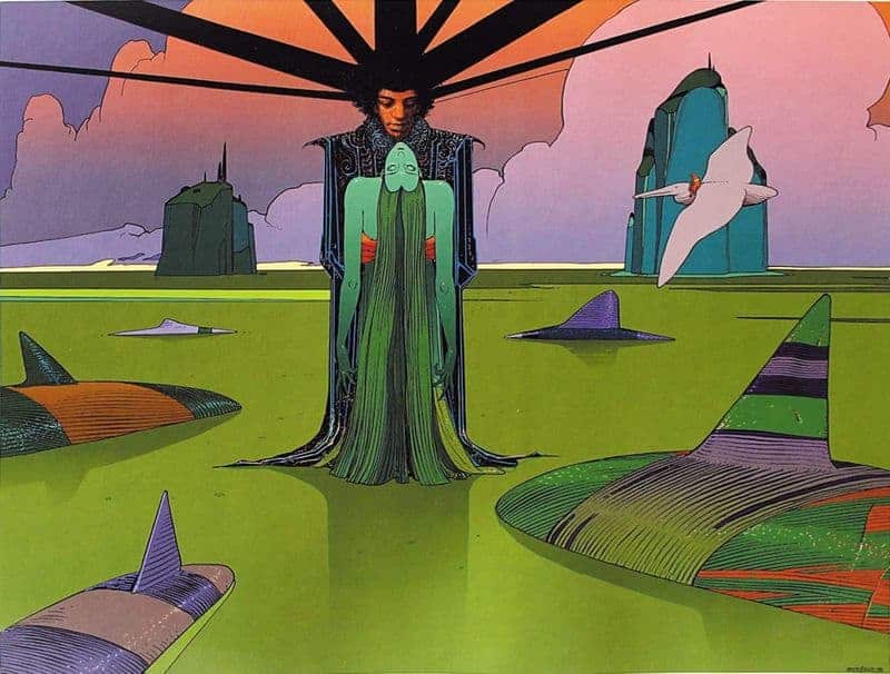 AI-Moebius Dreaming of Jimi HendrixIm Jahre 1975 zeichnete Moebius das Cover der französischen Hendrix-Compilation «Are You Experienced, Axis: Bold As Love», die Bilder dazu könnt ihr unten bewundern.