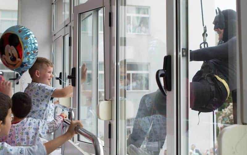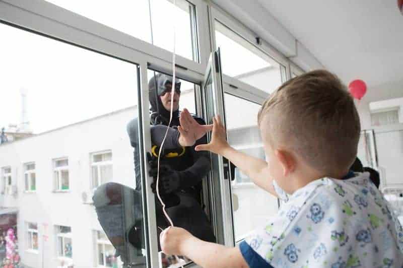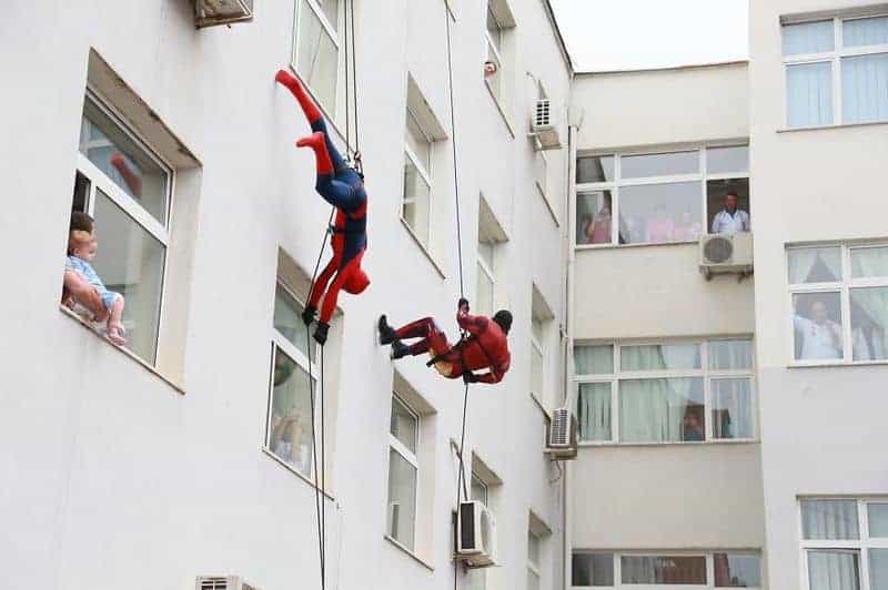 Am 1. Juni 2016 war der Internationale Tag des Kindes und so organisierte die albanische Polizei zusammen mit ihren Spezialeinheiten eine Überraschung für Kids, die diesen Tag nicht draussen mit ihren Freunden feiern konnten, sondern im Spital verbringen mussten. Und so sprangen an diesem Tag Superhelden von der Terrasse in die Fenster der im Spital liegenden Kindern, um Geschenke und Abzeichen mit dem Aufdruck: «Du bist unser Held!» zu verteilen!