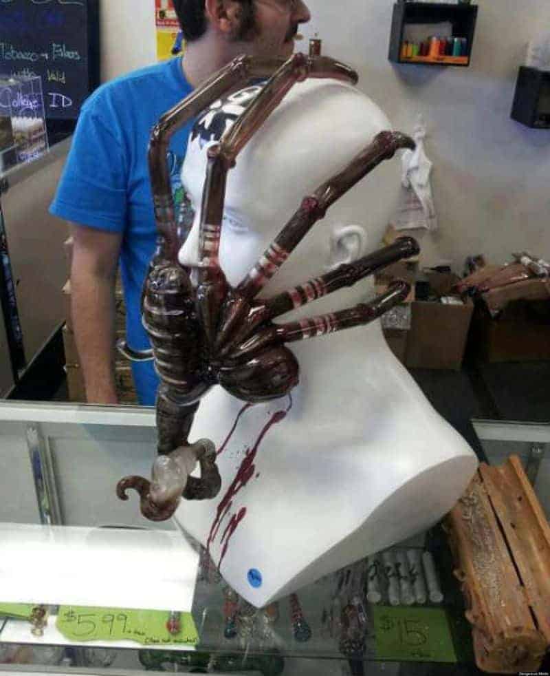 Freunde, schaut euch dieses Prachtexemplar von Pfeife an. Einfach der Wahnsinn, oder? Für all diejenigen unter euch, die ein wenig mehr Schrecken bei ihrer Glaukom-Medikation erleben möchten. Dieses Alien Facehugger Bong macht dich paranoid, auch wenn du nüchtern bist…