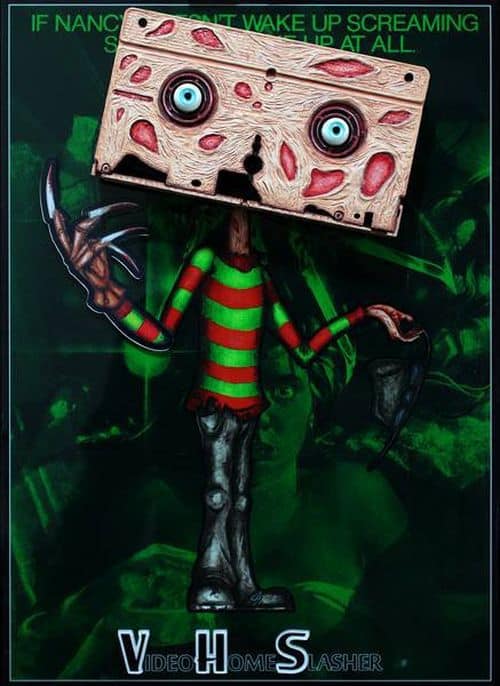 Bekanntlich ist das VHS-Format technisch vor gut 10 Jahren gestorben und machte den Weg frei für DVDs und Blu-rays. Doch in den letzten Jahren haben die Fans des VHS-Formats keine Mühen gescheut, um das VHS-Band einer unerwarteten Wiederauferstehung zu bescheren. Doch jetzt geht es nicht darum, sondern um den französischen Künstler Patrick Massobrio, der auch seinen Teil tut, um das VHS-Format am Leben zu erhalten. Massobrio liebt das Format wegen seiner Verbindungen zu seiner Kindheit und verwendet diese vertrauten Bänder und Boxen, um völlig neue Kunstwerke, inspiriert von den Horror-Ikonen, zu schaffen. Obwohl keines der Stücke zu verkaufen ist, lohnt sich ein Besuch auf seiner Website!