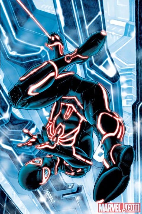 Ein grossartiges Mash-Up aus Spidey und Tron – welches das Cover zum am 15.12. erscheinenden Comic ist und doch absolut phantastisch rüber kommt…