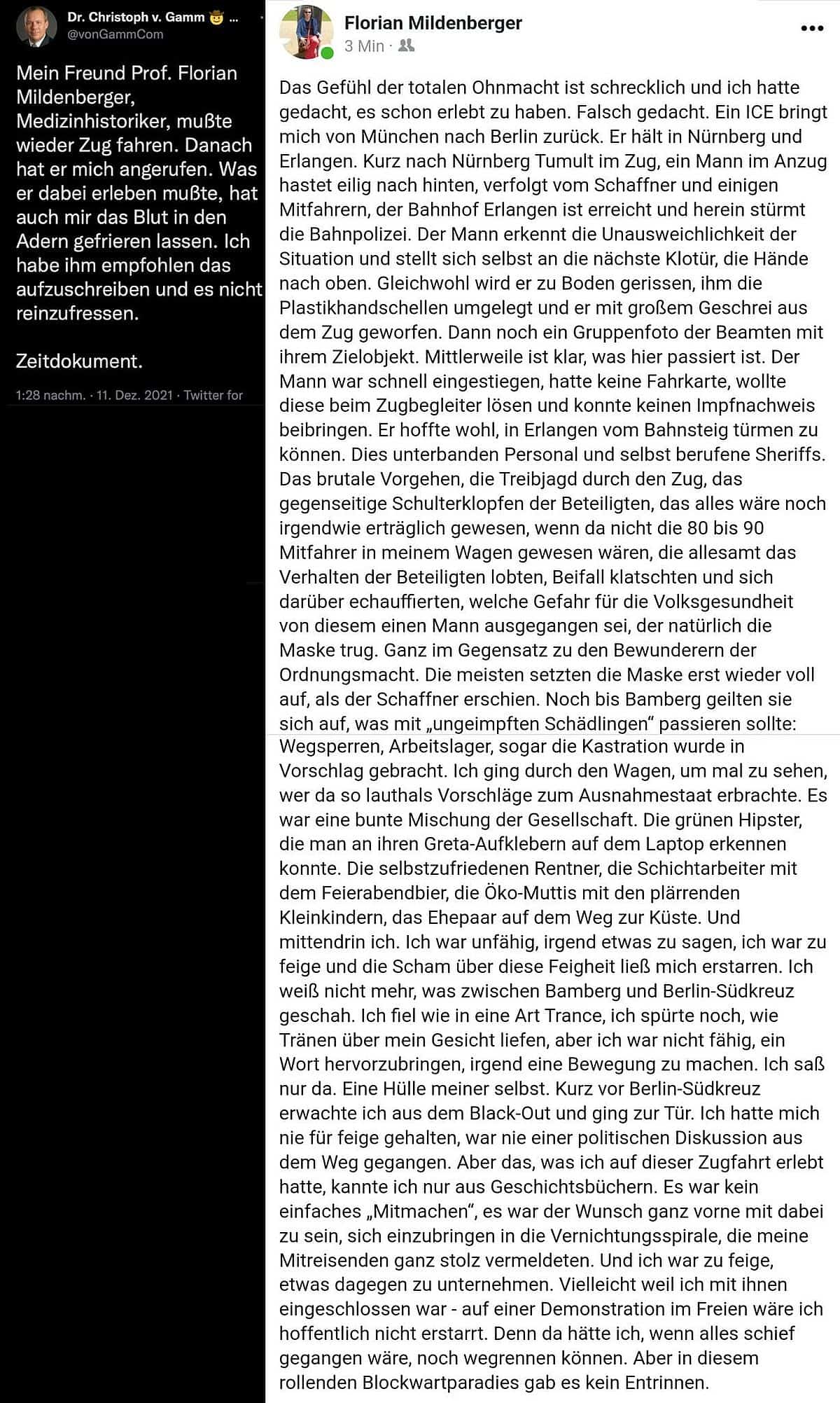Mein Freund Prof. Florian Mildenberger, Medizinhistoriker, mußte wieder Zug fahren. Danach hat er mich angerufen. Was er dabei erleben mußte, hat auch mir das Blut in den Adern gefrieren lassen. Ich habe ihm empfohlen das aufzuschreiben und es nicht reinzufressen.