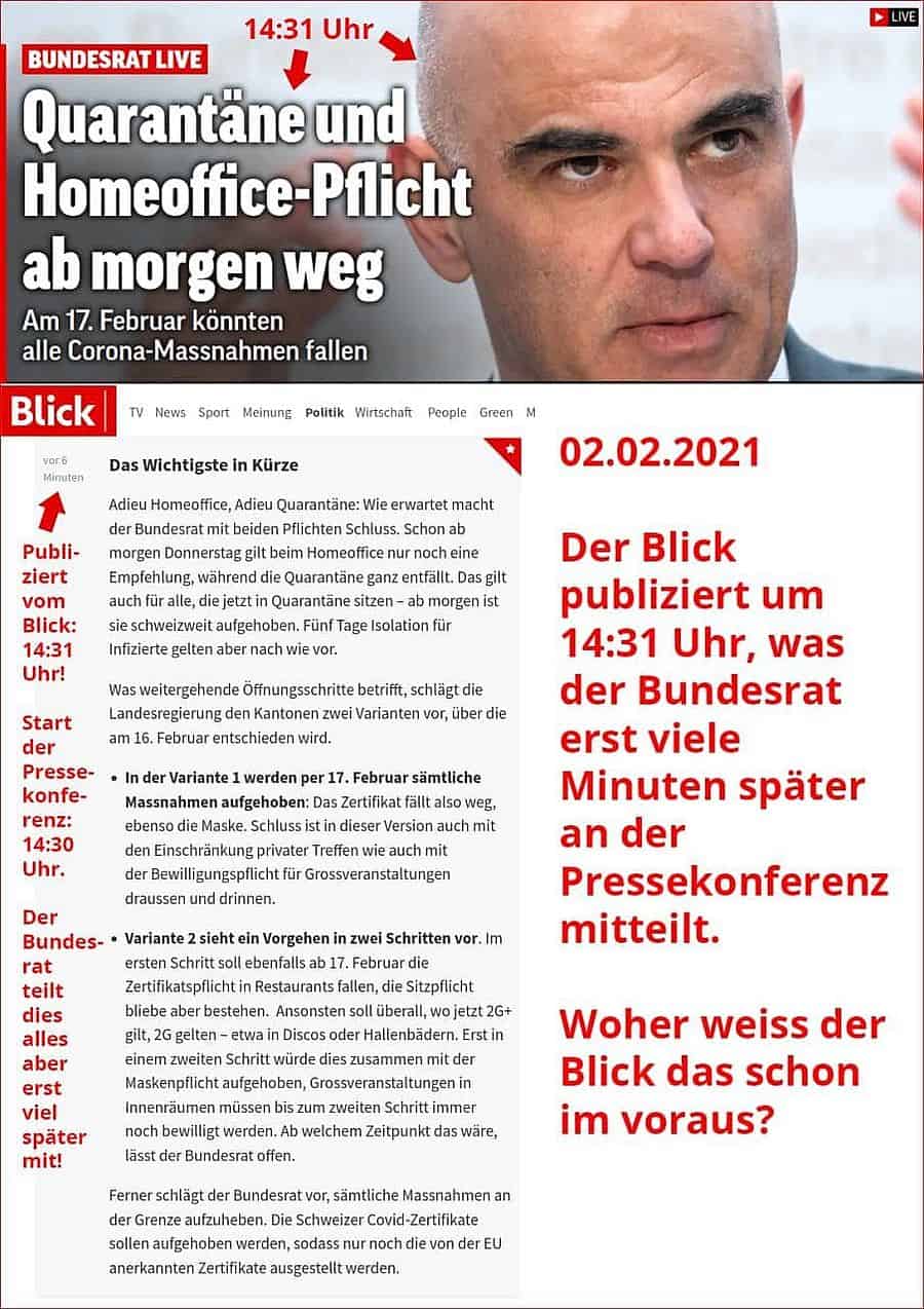 Blick berichtet spannenderweise schon um 14:31 Uhr, was der Bundesrat verkündet hat, BEVOR der Bundesrat dies an der Pressekonferenz präsentiert: