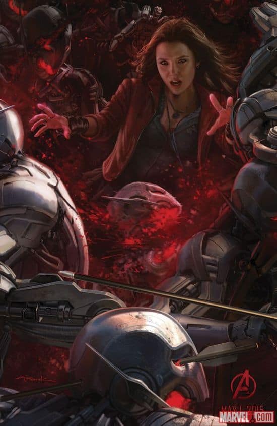 Hier haben wir Tony Stark aka Iron Man und unten den Neuzugang Scarlett Witch. Beide kämpfen gegen die Dronen von Ultron, dem zerstörerischen Bösewicht im neuen Film. Dieser ist zu Beginn eigentlich eine gutmütige Schöpfung Tony Starks, die ihm und seinen Rächerkollegen eine Pause von all den Kämpfen gönnen soll. Somit wird die Nebenhandlung um Tonys autarke Rüstungen in Iron Man 3 hier aufgegriffen und zur grossen Bedrohung. Denn Ultron bemerkt, dass die Dinge auf der Erde eigentlich viel cooler sein könnten, wenn der Mensch selbst nicht präsent wäre. Somit werden er und seine Iron Legion zur Bedrohung für die ganze Menschheit. Die Avengers sind wieder gefragt.