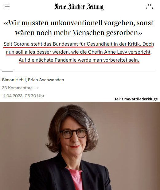 BAG-Chefin Anne Lévy versucht sich in Schadensbegrenzung und gelobt Besserung bei der «nächsten» Pandemie! Es ist wirklich unfassbar, mit welcher Nonchalance BAG-Chefin Anne Lévy das totale Versagen ihres Amtes wegwischen will. Im ersten Artikel der NZZ wurde Lévy mit der Schlagzeile zitiert: «Wir mussten unkonventionell vorgehen, sonst wären noch mehr Menschen gestorben». Mittlerweile steht im gleichen Artikel geschrieben «Wir mussten unkonventionell vorgehen, sonst hätte sich die Impfkampagne um drei Monate verzögert – und es wären noch mehr Menschen an Covid-19 gestorben.» Das dies eine Lüge ist, sollte mittlerweile auch dem letzten einigermassen klar denkenden Menschen bewusst sein. Was soll dieses «unkonventionelle» Handeln in Anne Lévys Augen wohle heissen? Vielleicht…