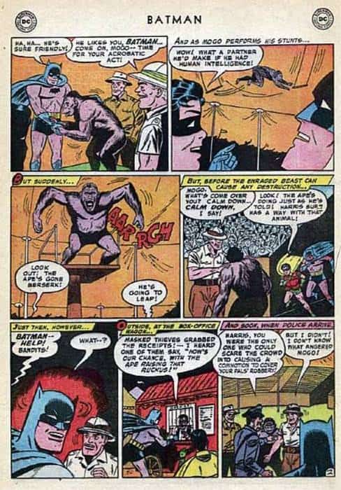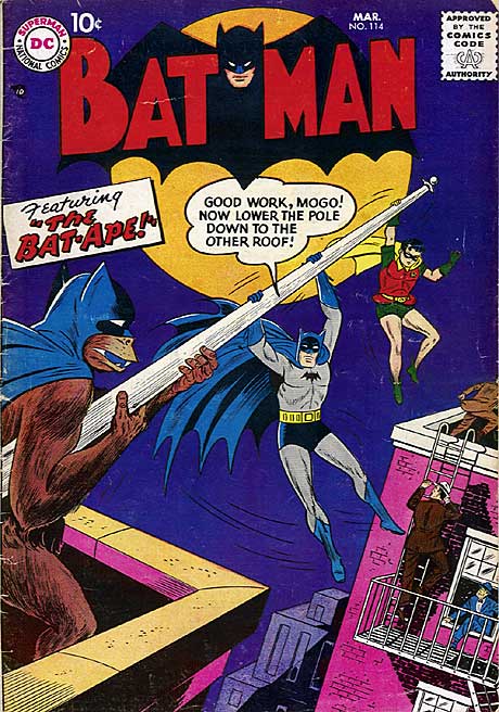 Produziert im Jahre 1958, taucht im Batman Band #114 zu ersten mal Bat-Ape auf, ein Affe, der aus dem Zirkus entkommt, um fortan Batman und Robin zu helfen die Kriminalität zu bekämpfen. Snip aus der Einleitung: