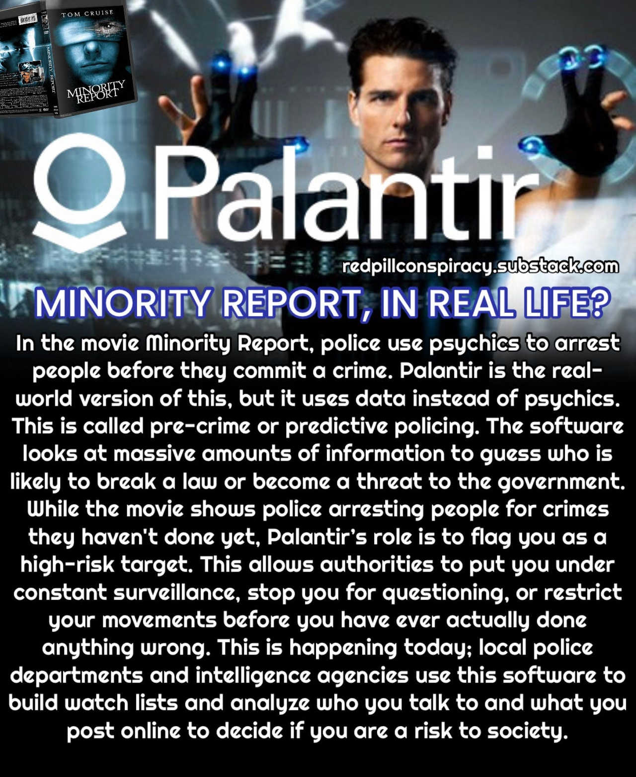 Minority Report, im realen Leben? Im Film Minority Report setzt die Polizei Hellseher ein, um Menschen zu verhaften, bevor sie ein Verbrechen begehen. Palantir ist die reale Version davon, verwendet aber Daten anstelle von Hellsehern. Dies wird als präventive Polizeiarbeit oder Predictive Policing bezeichnet. Die Software analysiert riesige Datenmengen, um vorherzusagen, wer wahrscheinlich ein Gesetz brechen oder eine Bedrohung für die Regierung darstellen wird. Während der Film zeigt, wie die Polizei Menschen für Verbrechen verhaftet, die sie noch nicht begangen haben, besteht die Rolle von Palantir darin, Sie als Hochrisikoziel zu kennzeichnen. Dies ermöglicht es den Behörden, Sie ständig zu überwachen, Sie zu Verhören anzuhalten oder Ihre Bewegungsfreiheit einzuschränken, bevor Sie überhaupt etwas Falsches getan haben. Dies geschieht bereits heute; lokale Polizeibehörden und Geheimdienste nutzen diese Software, um Beobachtungslisten zu erstellen und zu analysieren, mit wem Sie sprechen und was Sie online posten, um zu entscheiden, ob Sie ein Risiko für die Gesellschaft darstellen.