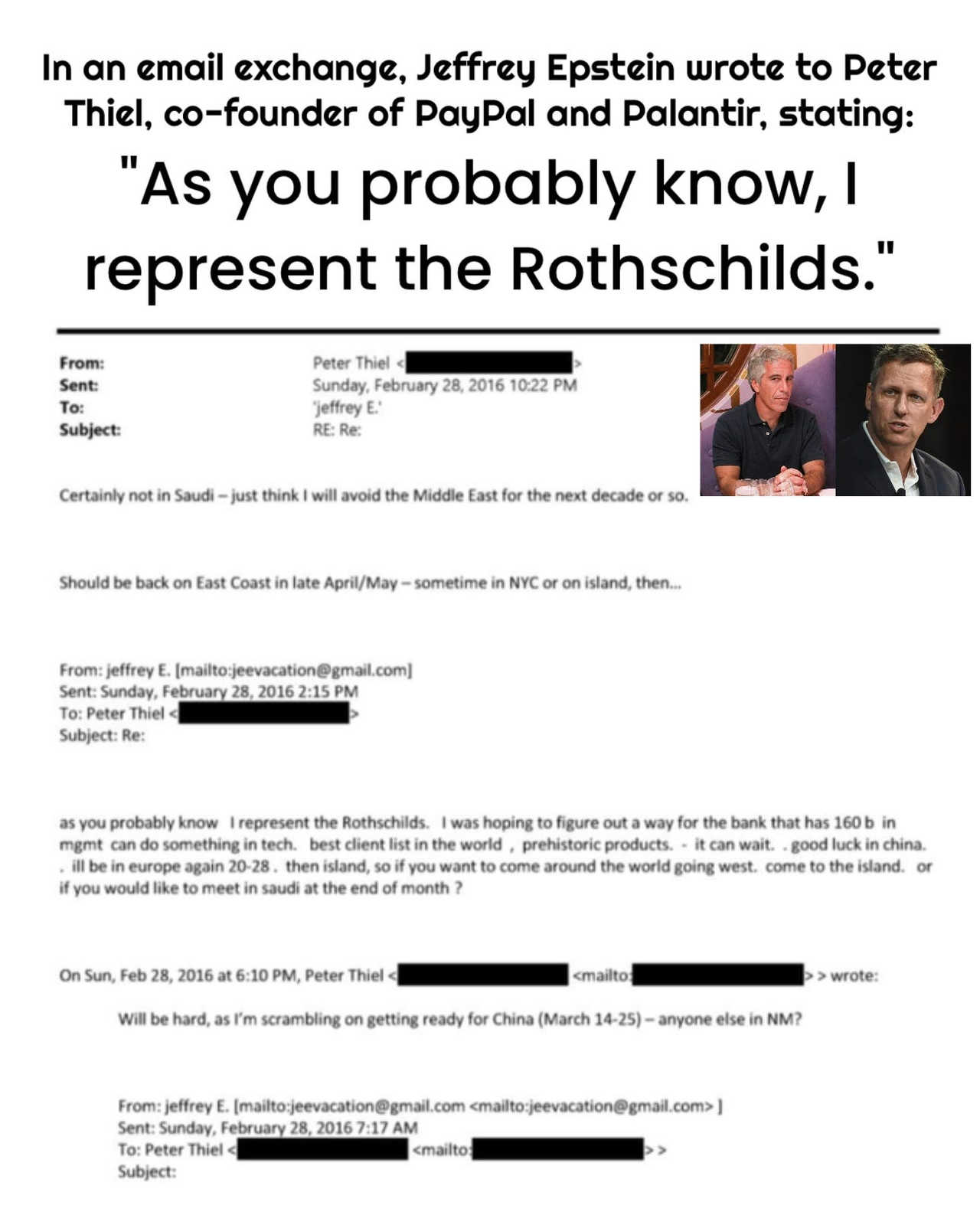 In einem E-Mail-Austausch schrieb Jeffrey Epstein an Peter Thiel, Mitbegründer von PayPal und Palantir: «Wie Sie wahrscheinlich wissen, vertrete ich die Rothschilds. Ich hatte gehofft, einen Weg zu finden, wie die Bank mit 160 Milliarden im Management etwas im Technologiebereich erreichen kann. Beste Kundenliste der Welt, prähistorische Produkte. Das kann warten… Viel Glück in China. Ich bin vom 20. bis 28. wieder in Europa. Danach auf der Insel. Wenn Sie also um die Welt reisen und nach Westen fahren möchten, kommen Sie auf die Insel. Oder möchten Sie sich Ende des Monats in Saudi-Arabien treffen?»