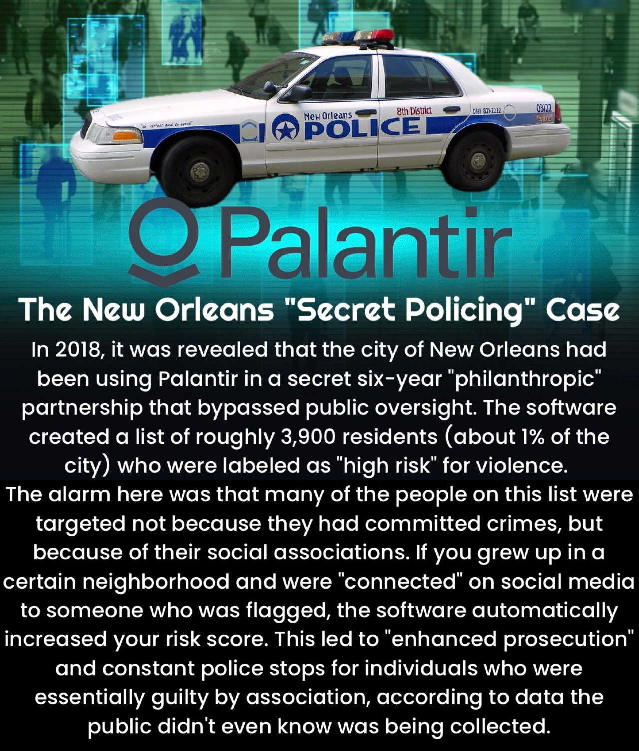 Der Fall der «geheimen Polizeiarbeit» in New Orleans Im Jahr 2018 wurde bekannt, dass die Stadt New Orleans Palantir in einer geheimen, sechsjährigen «philanthropischen» Partnerschaft eingesetzt hatte, die die öffentliche Aufsicht umging. Die Software erstellte eine Liste von etwa 3900 Einwohnern (etwa 1 % der Stadt), die als «hochriskant» für Gewalt eingestuft wurden. Das Alarmierende daran war, dass viele der Personen auf dieser Liste nicht wegen begangener Straftaten, sondern aufgrund ihrer sozialen Verbindungen ins Visier genommen wurden. Wenn man in einer bestimmten Gegend aufgewachsen war und in sozialen Medien mit jemandem «verbunden» war, der markiert wurde, erhöhte die Software automatisch den Risikowert. Dies führte zu «verstärkter Strafverfolgung» und ständigen Polizeikontrollen von Personen, die im Wesentlichen durch ihre Verbindung schuldig waren, basierend auf Daten, von deren Erhebung die Öffentlichkeit nicht einmal wusste.