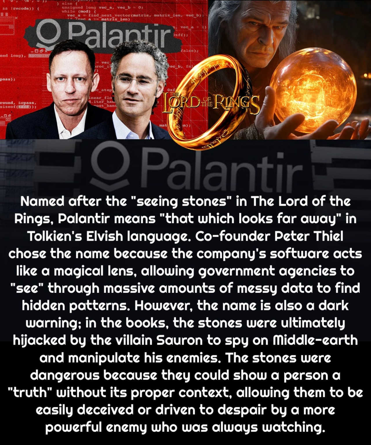 Palantir Benannt nach den «Sehersteinen» aus «Der Herr der Ringe», bedeutet Palantir in Tolkiens Elbensprache «das, was in die Ferne blickt». Mitbegründer Peter Thiel wählte den Namen, weil die Software des Unternehmens wie eine magische Linse funktioniert und es Regierungsbehörden ermöglicht, riesige Mengen unübersichtlicher Daten zu «durchschauen», um verborgene Muster zu erkennen. Der Name ist jedoch auch eine düstere Warnung; In den Büchern wurden die Steine schliesslich vom Bösewicht Sauron entführt, um Mittelerde auszuspionieren und seine Feinde zu manipulieren. Die Steine waren gefährlich, weil sie einer Person eine «Wahrheit» ohne den richtigen Kontext zeigen konnten, wodurch sie leicht getäuscht oder von einem mächtigeren Feind, der immer zusah, in die Verzweiflung getrieben werden konnte.