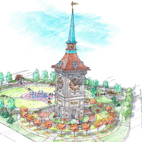 Mittlerweile hat man in Berne das Geld beisammen und es kann gebaut werden. Erst muss für den Platz platz gemacht werden und anschliessend wird mit dem Turmbau losgelegt, der etwa 1’000’000 $ Kosten soll, dann kommen noch Glockenspiel und diverser andere Schmuck dazu. Wer sich nun anhand der Zeichnung nicht wirklich ein Bild machen kann, hier ein Clip, wie das ganze aussehen soll: