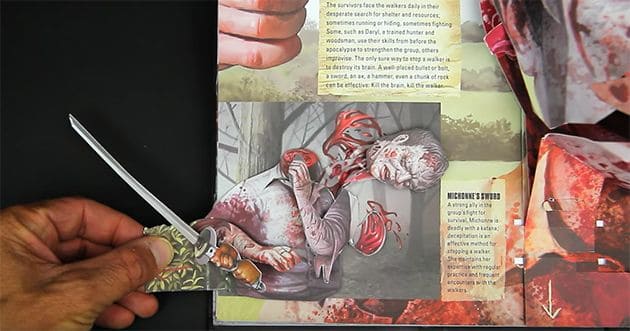 Als kleinen Rückblick auf die letzten 5 Staffeln gibt es jetzt dieses gigantischen Pop-Up Buch, das es bei uns im Shop gibt. Gleich beim Öffnen des Schinkens wird man bereits standesgemäss von einen Untoten begrüsst und an jeder kleinen Ecke gibt es etwas zu entdecken. Auch viele bekannte Szenen und Orte aus der Serie wurden hier von Becca Zerkin und David Hawcock in Papier verewigt. So z.B. Terminus oder die Farm von Hershel. Zusammen mit Illustratorin Sally Elizabeth Jackson ist ein echtes Horrorbuch entstanden, das die Serie nochmal ganz anders einfängt. Don’t open. Dead inside!
