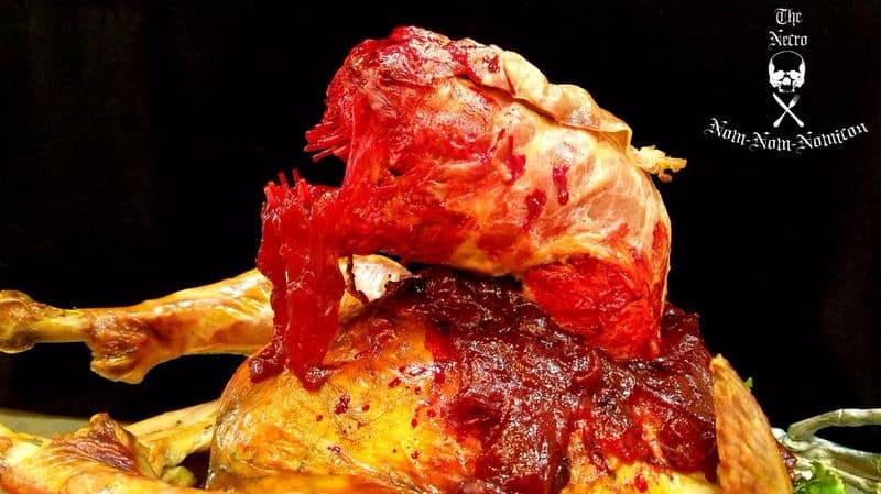 Tye Lombardi ist ein Schriftstellerin für die SyFy Zombie-Show «Z Nation» und hat einen tiefschwarzen Humor, wie sie «from the Devil’s Kitchen» in ihrem Blog «The Necro Nom-Nom-Nomicon» beweist. Dort schreibt sie über das Essen «aus der Teufelsküche» und für Thanksgiving dieses Jahr hat sich Lombardi ein ganz besonderes Abendessen einfallen lassen: Ein Truthahn mit einem Chestburster! Das Alien ist eine Schweinelende mit Prosciutto umwickelt und als Zähne dienen Spaghetti. Für das Blut verwendete sie Cranberry-Sauce und dazu wird eine grünem Sosse serviert. Für Menschen, die selbst Lust bekommen hat, seine Verwandten und Bekannten als Gastgeber einmal mit einem ganz besonderen Mahl zu überraschen, findet die Schritt für Schritt Anleitung zur Herstellung dieses Truthahn auf Lombardis Seite.