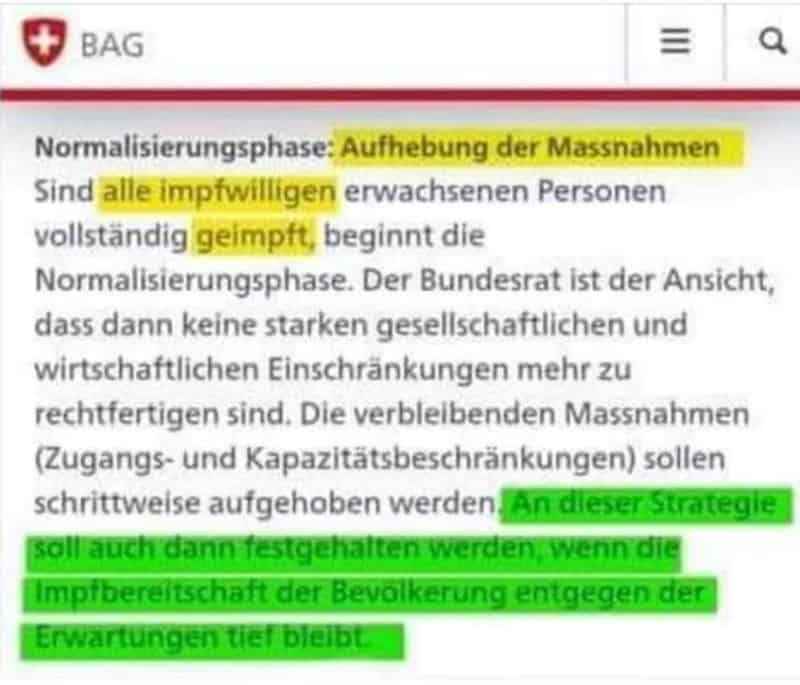 Sind alle Impfwilligen erwachsenen Personen vollständig geimpft, beginnt die Normalisierungsphase. Der Bundesrat ist der Ansicht, dass dann keine starken gesellschaftlichen und wirtschaftlichen Einschränkungen mehr zu rechtfertigen sind. Die verbleibenden Massnahmen (Zugangs- und Kapazitätsbeschränkungen) sollen schrittweise aufgehoben werden. an dieser Strategie soll auch dann festgehalten werden, wenn die Impfbereitschaft der Bevölkerung entgegen der Erwartungen tief bleibt.