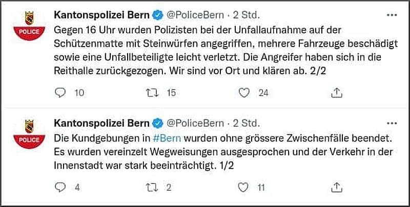 Auch heute versuchten selbsternannte «Antifaschisten»», ihre alte Nummer umzusetzen. Wieder wollten sie durchwegs friedliche Demonstranten in ein schlechtes Licht rücken, was ihnen aber danke aufmerksamer Kundgebungsteilnehmer, welche mit der Polizei zusammenarbeiteten, nicht gelang. Wütend griffen sie später dann auf der Schützenmatte Autobusse und Cars der Corona-Massnahmen-Demonstranten und die Berner Polizei vor der Berner Reithalle mit Steinen an, beschädigten mehrere Fahrzeuge, verletzten eine unbeteiligte Person und zogen sich in die Reitschule zurück, wo sie durch die Polizei unbehelligt blieben. Die Reitschule, ist das Zuhause und die Brutstätte der «Antifa». Es ist schlichtweg unverständlich, dass die Stadt Bern die Reithalle weiterhin finanziert! Es ist eine Schande, dass die Polizei und die Justiz diese Gewalttäter nicht dingfest machen! Oder sind dort Söhne und Töchter der Stadtberner Politker dabei? Oder sind es Handlanger des «Polizeidirektor» Reto Nause, der die Gewalttäter dort engagiert, um die Situation zu kreieren, welche zu seiner Politik passt? Fragen über Fragen…