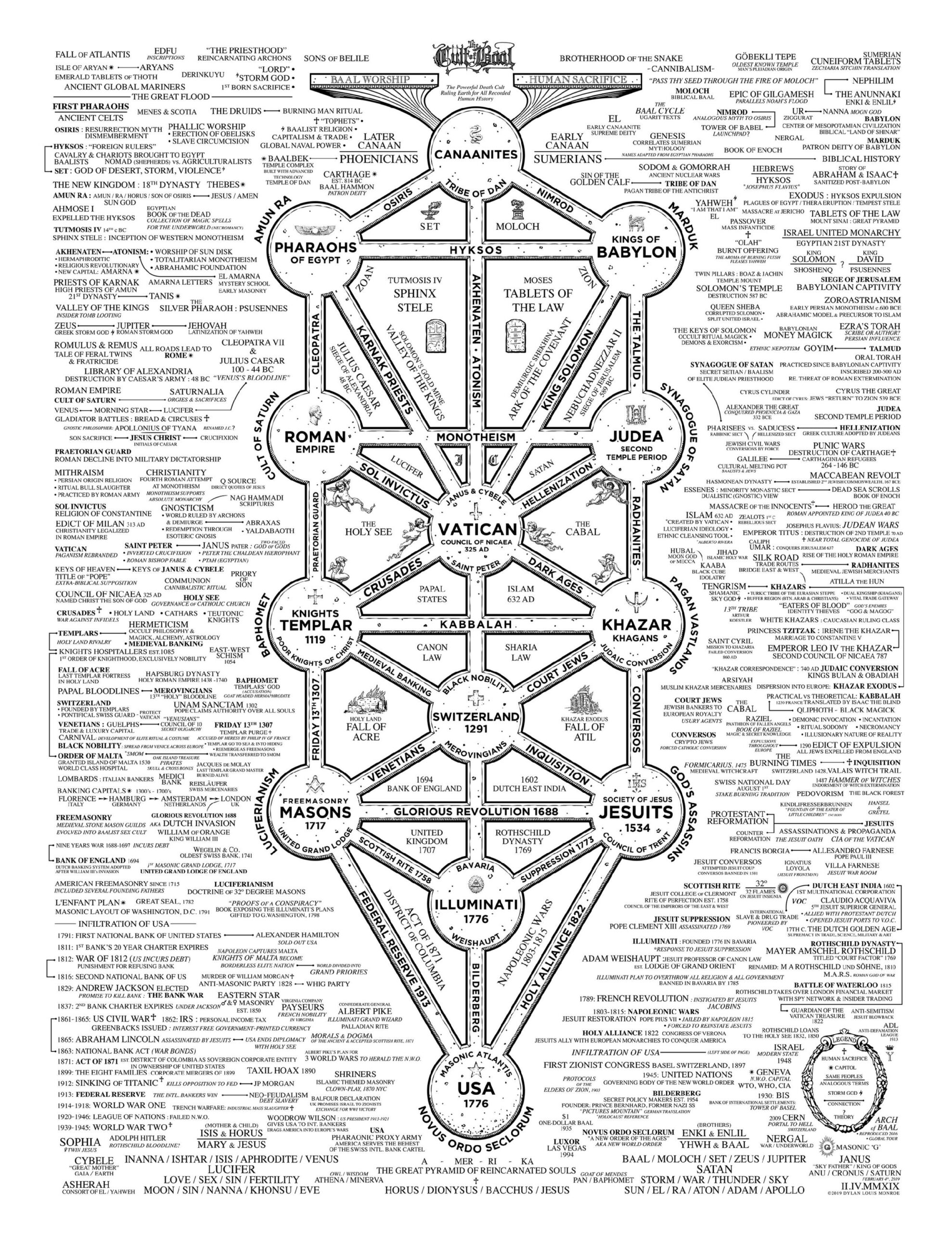 Diese Grafik folgt der Zeitlinie eines okkulten Glaubenssystems, das sich an Menschenopfern und Krieg erfreut und das Bankwesen als Werkzeug für die Weltherrschaft einsetzt.
