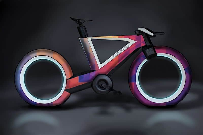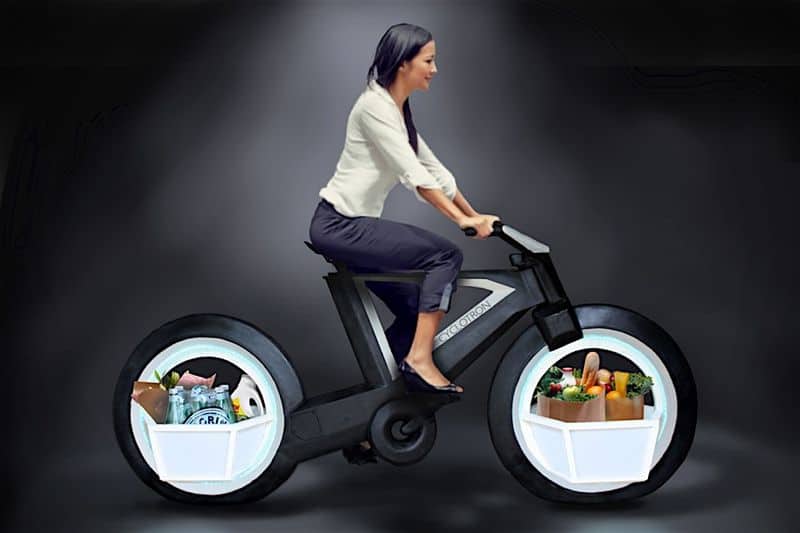 Dieses Fahrrad sieht aus, als würde es direkt aus dem Film «Tron» stammen. «Cyclotron» nennt es sich und wurde von einem Kreativteam aus Los Angeles entworfen. Im Gegensatz zu üblichen Bike-Konzepten haben die Designer beim Cyclotron auf zwei wichtige Komponenten verzichtet: Es verfügt weder über Naben noch Speichen. Ziel dessen ist, einen schlankeren und aerodynamischeren Look zu erzeugen. Der Rahmen besteht dabei aus einem ultraleichten Kohlefaser-Verbund, der zusätzlich für Fliegengewicht sorgt. Ein cooles Gimmick sind die Körbe, die sich in die speichenlosen Räder einklinken lassen und Platz für den kleinen Einkauf nach der Arbeit oder Ähnliches bieten. In die Radkästen integrierte LED sorgen bei Nacht für super Sichtbarkeit, ausserdem bringt Cyclotron eine App mit, die das Smartphone zum Fahrradcomputer macht…
