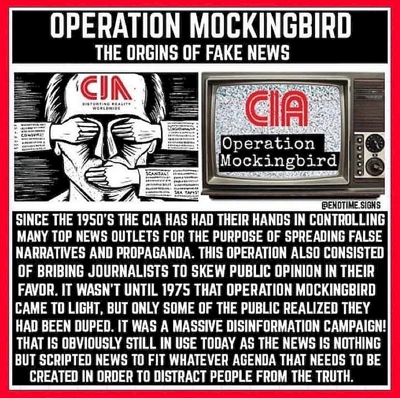 Viele Top-Nachrichtenwerden nur zu einem Zweck verbreitet, falsche Narrative und Propaganda zu verbreiten. Diese Operation findet auch in der Bestechung von Journalisten statt, um die öffentliche Meinung zu ihren Gunsten zu lenken. Erst 1975 kam die Operation «Mockingbird» ans Licht, aber nur ein Teil der Öffentlichkeit erkannte, dass sie betrogen worden waren. Es war eine riesige Desinformationskampagne! Das wird offensichtlich auch heute noch verwendet, da es sich bei den Nachrichten um nichts anderes als geschriebene Geschichten handelt, die zu der politschen Agenda passen, die erstellt werden muss, um die Menschen von der Wahrheit abzulenken.