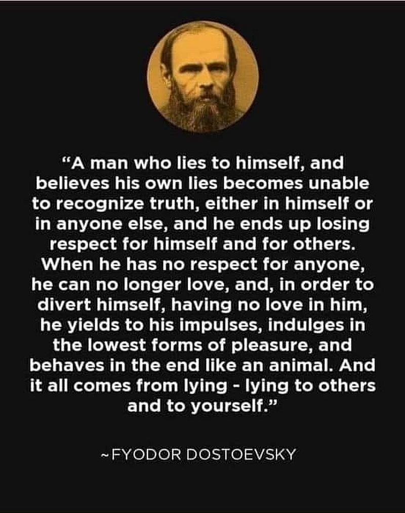 Ein Mensch, der sich selbst belügt und an seine eigenen Lügen glaubt, wird unfähig, die Wahrheit zu erkennen, weder in sich selbst noch in irgendjemand anderem, und er verliert schließlich den Respekt für sich selbst und für andere. Wenn er vor niemandem Respekt hat, kann er nicht mehr lieben, und um sich abzulenken, gibt er sich, ohne Liebe in sich, seinen Trieben hin, gibt sich den niedrigsten Formen der Lust hin und benimmt sich schliesslich wie ein Tier . Und das kommt alles vom Lügen – Lügen gegenüber anderen und sich selbst.