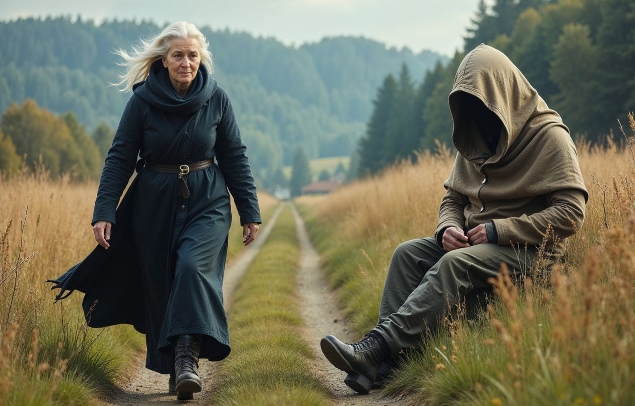 Es war eine kleine Frau, die den staubigen Feldweg entlang kam. Sie war wohl schon recht alt, doch ihr Gang war leicht und ihr Lächeln hatte den frischen Glanz eines unbekümmerten Mädchens. Bei einer zusammengekauerten Gestalt blieb sie stehen und sah hinunter. Sie konnte nicht viel erkennen. Das Wesen, das da im Staub auf dem Wege sass, schien fast körperlos. Sie erinnerte an eine graue Flanelldecke mit menschlichen Konturen.