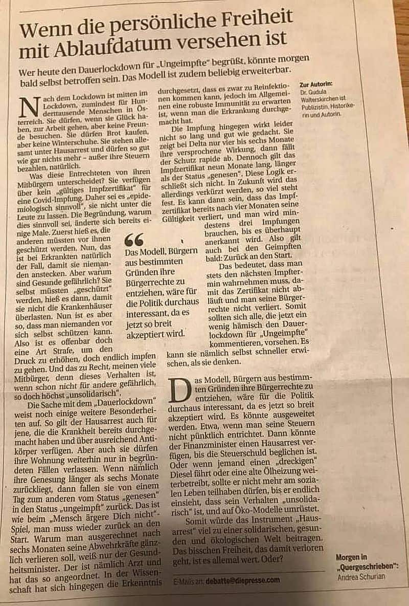 Frau Walterskirchen bringt es auf den Punkt, den Freiheit wird Scheibchenweise abgebaut und wer nach diesen zwei Jahren tatsächlich das Gefühl hat, dass wir diese wie früher zurück erhalten werden, muss ich fragen, was er denn Nachts träumt. Die Corona-Krise ist der Anfang dazu, was auch bemerkt, der Etablierung von Zwang und Willkür! Und dazu kann man nur sagen: Wehret den Anfängen!