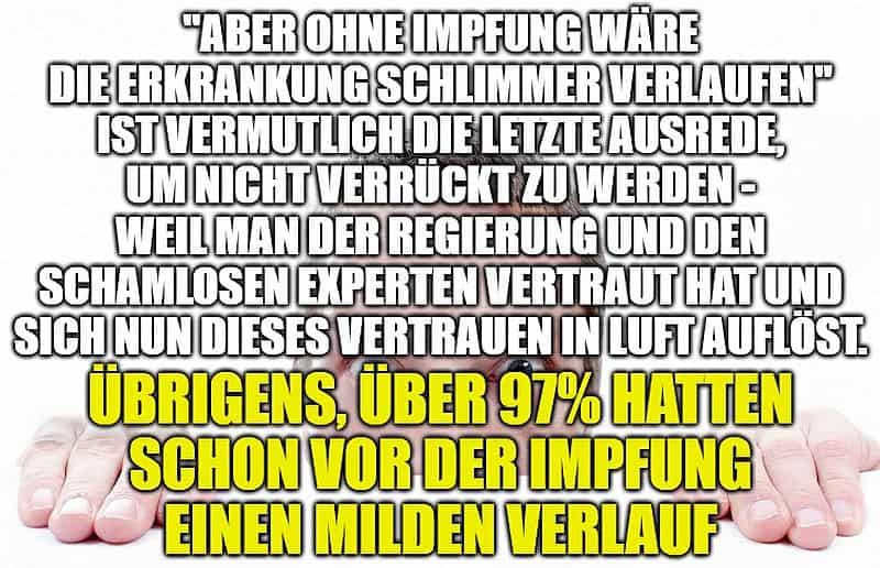 «Aber ohne Impfung wäre die Erkrankung schlimmer verlaufen» ist vermutlich die letzte Ausrede, um nicht verrückt zu werden – weil man der Regierung und den schamlosen Experten vertraut hat und sich nun dieses Vertrauen in Luft auflöst. Übrigens, über 97% hatten schon vor der Impfung einen milden Verlauf!