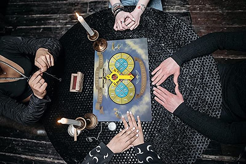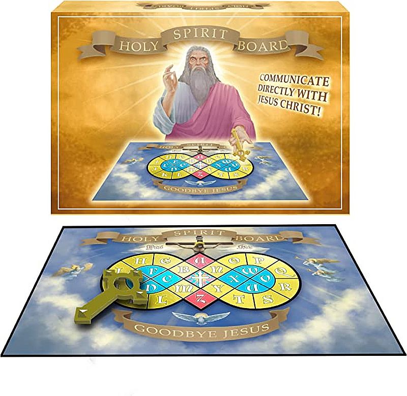 Mit diesem «Holy Spirit Board» (Heilig-Geist-Brett) von Holy Spirit Games ist ein christlich-religiöses Ouija-Board mit direktem Draht zu Jesus. Das «Heilig-Geist-Brett» verwendet eine Planchette, ein typisches herzförmiges Stück Holz oder Plastik, das auf Ouiji-Boards verwendet wird, um während einer Séance Botschaften zu buchstabieren. Nur das «christliche» Brett verwendet eine Planchette in Form eines goldenen «magischen Kreuzes».