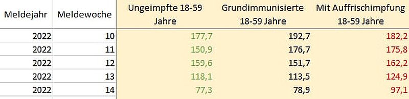 Verwunderlich ist allerdings, dass zeitgleich im aktuellen (allen bekannten) Wochenbericht vom 21.04.22 für die gleichen KWs 10-14 immer noch eine positive Impfeffektivität gegen symptomatische Fälle für die selbe Altersgruppe angegeben wird. Das passt nicht. Denn die Rohdaten müssten exakt die Gleichen sein. Es sind einmal die Meldungen symptomatischer Fälle, die über die Ämter an das RKI weitergeleitet werden, sowie der Anteil der jeweiligen Gruppen (unvaxxed & 3x vaxxed) an der Gesamtbevölkerung, die aus dem Impfmonitoring des RKI stammen dürften. Es müsste im Ergebnis eine negative Impfeffektivität errechnet werden für die letzten Wochen. Stattdessen sehen wir jedoch eine Positive. Hier stimmt etwas gewaltig nicht. Vorherige Vermutungen meinerseits, dass sich die Ungleichheit in den Daten durch Zusammenfassen mehrerer Wochen bei der Effektivität erklären lässt, lassen sich widerlegen. Es sind in beiden Fällen wöchentliche Berechnungen.