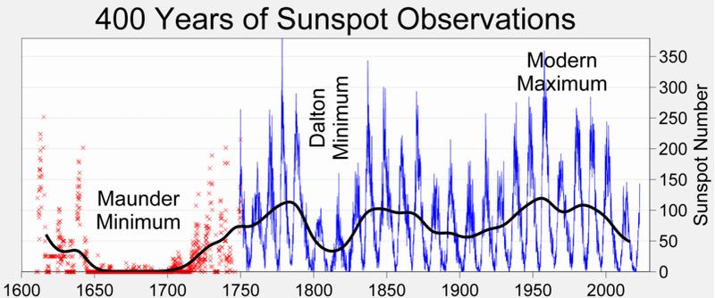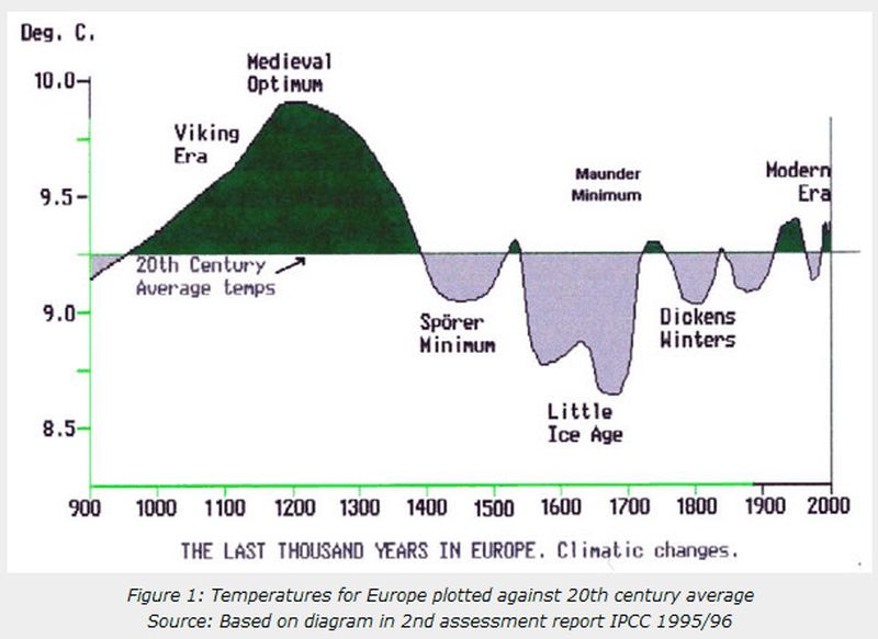 Das dunkle Mittelalter wich der mittelalterlichen Warmzeit, in der in ganz Europa prächtige Kathedralen gebaut wurden und Wikinger sich in Grönland niederliessen. Diese günstigen Bedingungen machten wiederum der Kleinen Eiszeit (~1300 bis ~1800) Platz. Es wurde so kalt, dass auf der zugefrorenen Themse Eisfeste abgehalten und die Wikinger aus dem eisbedeckten Grönland vertrieben wurden. Die moderne Wissenschaft machte dann Fortschritte und stellte fest, dass diese Kälteperioden mit Perioden extrem geringer Sonnenaktivität, z.B. dem Maunder-Minimum, zusammenfielen.