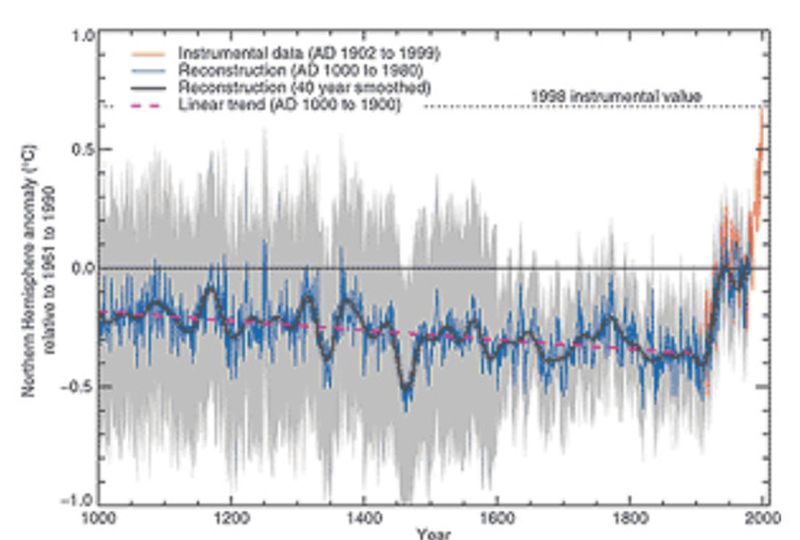 Dies führte zur Erstellung der gefälschten Hockeyschläger-Grafik der globalen Temperaturen, die anstelle der Realität fast keine Veränderung in 1000 Jahren und dann einen plötzlichen Anstieg in den späten 1900er Jahren zeigte. Der verlogene UN-Weltklimarat (IPCC) förderte diese Grafik mit Freude, da sie die globale Erwärmung des späten 20. Jahrhunderts als beispiellos darstellte und ihre Behauptung vom «CO2-Kontrollknopf» stützte. Es bedurfte jahrelanger beharrlicher Nachforschungen einer kleinen Gruppe von Klimarealisten, die von IPCC-Wissenschaftlern, die sich weigerten, ihre Daten zu veröffentlichen, daran gehindert wurden, um zu beweisen, dass die Hockeyschläger-Grafik eine Fälschung war, die auf fehlerhaften Daten und statistischen Schikanen beruhte. Das Buch «The Hockey Stick Illusion» beschreibt die Täuschung im Detail.