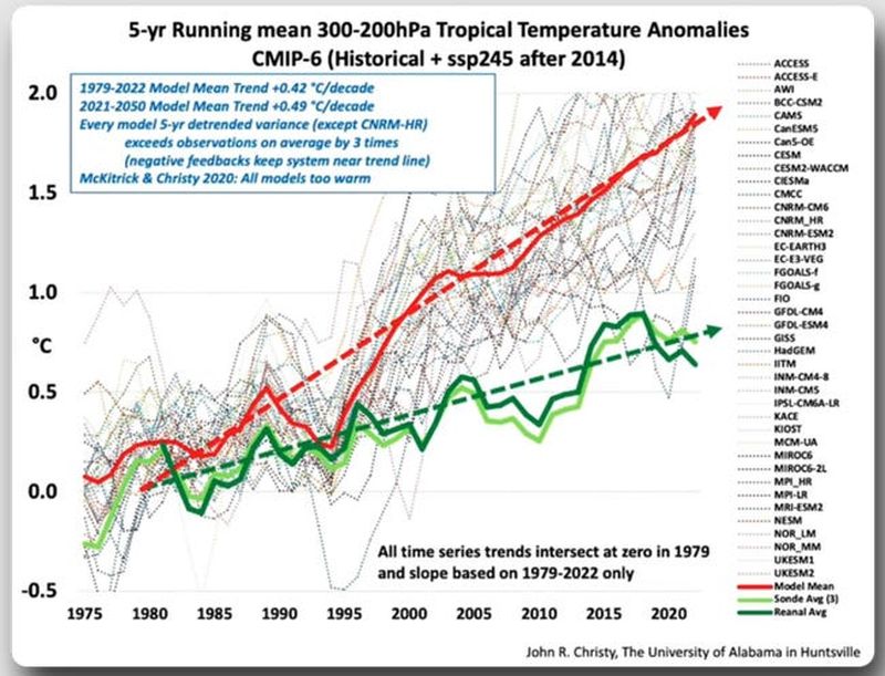 Ein weiterer Beweis dafür, dass die CO2-Erderwärmung ein Schwindel ist, ist das klägliche Versagen der Computerklimamodelle des Establishments bei der Erstellung glaubwürdiger globaler Temperaturvorhersagen. Hier versagen sie kläglich in den Diagrammen der Vorhersagen im Vergleich zu den Beobachtungen im Jahr 2015 und noch schlimmer im Jahr 2022. Ein weiterer Beweis sind die «Chicken Licken»-Vorhersagen des Establishments über klimabedingte Katastrophen, die seit 20 Jahren und mehr nicht eingetreten sind. Ebenso wurde der vom Establishment erfundene «Klimanotstand» durch die von Tausenden von unabhängigen Wissenschaftlern unterzeichnete Weltklimaerklärung widerlegt.