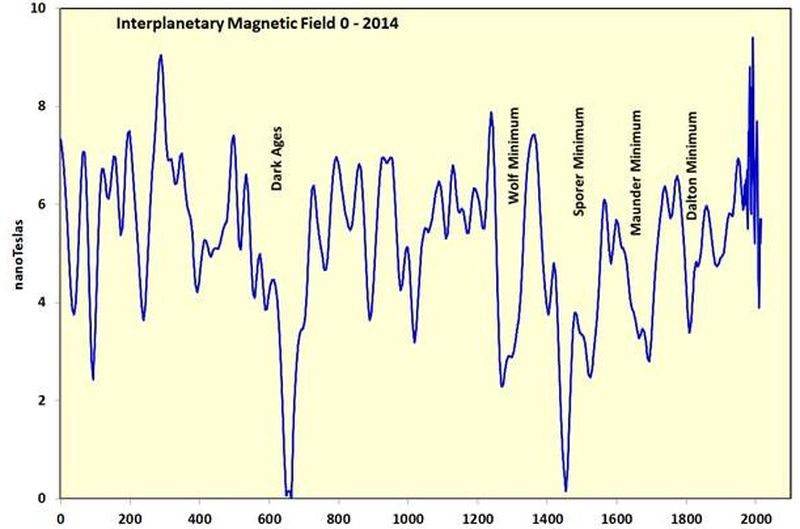 Schwankungen in der Magnetfeldstärke der Sonne sind eindeutig ein sehr wichtiger natürlicher «Kontrollknopf» des globalen Klimas. Siehst du, wie gut diese grafische Rekonstruktion die Höhen und Tiefen der globalen Temperatur in den letzten zwei Jahrtausenden abbildet, wie oben beschrieben, wobei der starke Höhepunkt Ende des 20. Jahrhunderts mit dem Beginn des Klimawandel-Schwindels des Establishments zusammenfiel.