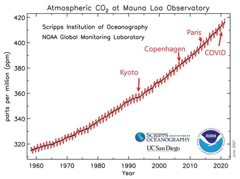- Der CO2-Gehalt in der Atmosphäre steigt seit Jahrzehnten steil an, unbeeinflusst von den verschiedenen «bahnbrechenden» Klimavereinbarungen (oder den globalen Covid-Lockdowns), die in dieser kommentierten Mauna-Loa-Grafik dargestellt sind. Es gibt keinen Hinweis darauf, dass die bisherigen Dekarbonisierungsbemühungen irgendeine Auswirkung auf den steigenden Trend hatten oder dass verstärkte Dekarbonisierungsbemühungen ihn in absehbarer Zeit aufhalten könnten, geschweige denn ihn in einen steilen Rückgang verwandeln könnten.