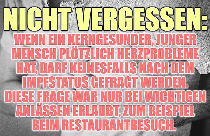 Nicht vergessen: Wenn ein kerngesunder, junger Mensch plötzlich Herzprobleme hat, darf keinesfalls nach dem Impfstatus gefragt werden. Diese Frage war nur bei wichtigen Anlässen erlaubt, zum Beispiel beim Restaurantbesuch.