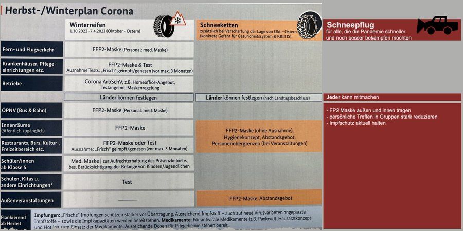 Mehr Verachtung kann die Politik uns Bürgern gegenüber kaum noch ausdrücken! Dieses Bild zum Infektionsschutzgesetz setzt Menschen dem Automobil gleich und zeigt somit, dass die Politik die Menschen als Sache sieht, ähnlich der Ansicht welche man rechtlich dem Tier gegenüber entgegen bringt. Somit hat die Politik den Menschen zu Nutzvieh degradiert – und wenn man sieht, wie Politik und Behörden die letzten über zwei Jahre mit den Bürgern umgehen, sind wir in ihren Augen nicht mehr als Nutzvieh. Ich bin aber kein Auto, ich muss auch nicht zum TÜV – als Souverän habe ich eine Partei gewählt, damit diese meine Interessen wahrnimmt und nicht um mich nach Strich und Faden zu verarschen! Übrigens sollte man nicht auf Geisterfahrer hören, wenn es um Bereifung geht…