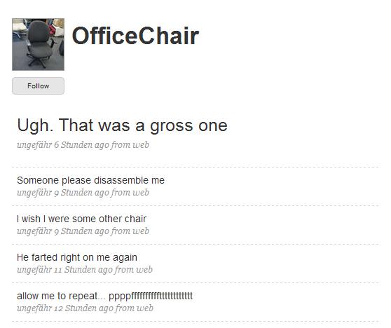 Es gibt immer wieder Jungs (und vielleicht auch Mädels?), die stolz auf jedes Fürzchen sind, welches ihnen «entweicht». Randy Sarafan hat nun beschlossen, seinem Bürostuhl zu helfen und das «Leben» dessen automatisch zu «dokumentieren» und das ganze über ein Twitter Konto zu veröffentlichen.