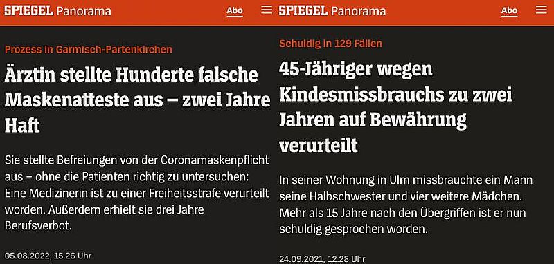 Ausstellen von Maskenattesten einer Ärztin -> Zwei Jahre Haft ohne Bewährung! 129-facher Kindesmissbrauch -> Zwei Jahre auf Bewährung! Das Signal: Kinderschändung ist ein Kavaliersdelikt, aber wenn jemand etwas macht gegen die Staatsdoktrin, dann ist er ein Schwerverbrecher. Schon Mao wusste: Bestrafe einen, erziehe hunderte.