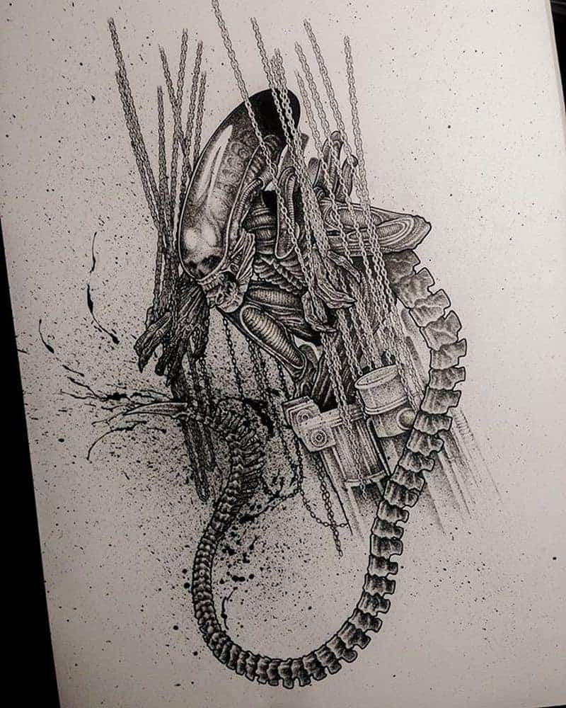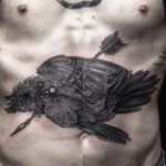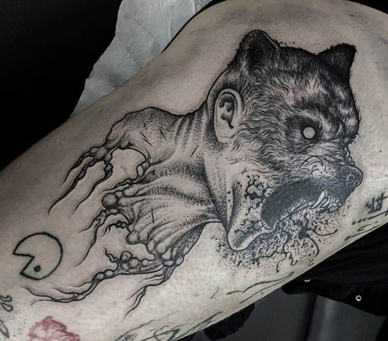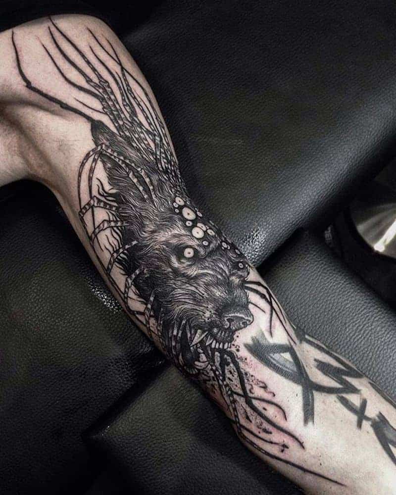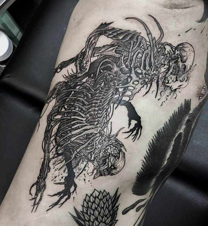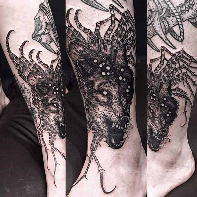 Der in der französischen Hafenstadt Marseille ansässige Jeanchoir ist Tätowierer und Gründer von Sombre Tâche. Sein Studio ist mit allen Arten von gottlosen und verstörend aussehenden Illustrationen und Designs gefüllt. Son finden sich in der albtraumhaften Sammlung Tausendfüssler-Hybriden, Wölfe, Spinnen und menschliche Skeletten, die nur darauf warten, ihrem neuen Gastgeber für die Ewigkeit unter die Haut zu gehen. Mehr von Jeanchoirs einzigartigen und beunruhigenden Tintenwerken gibts auf Instagram zu sehen…