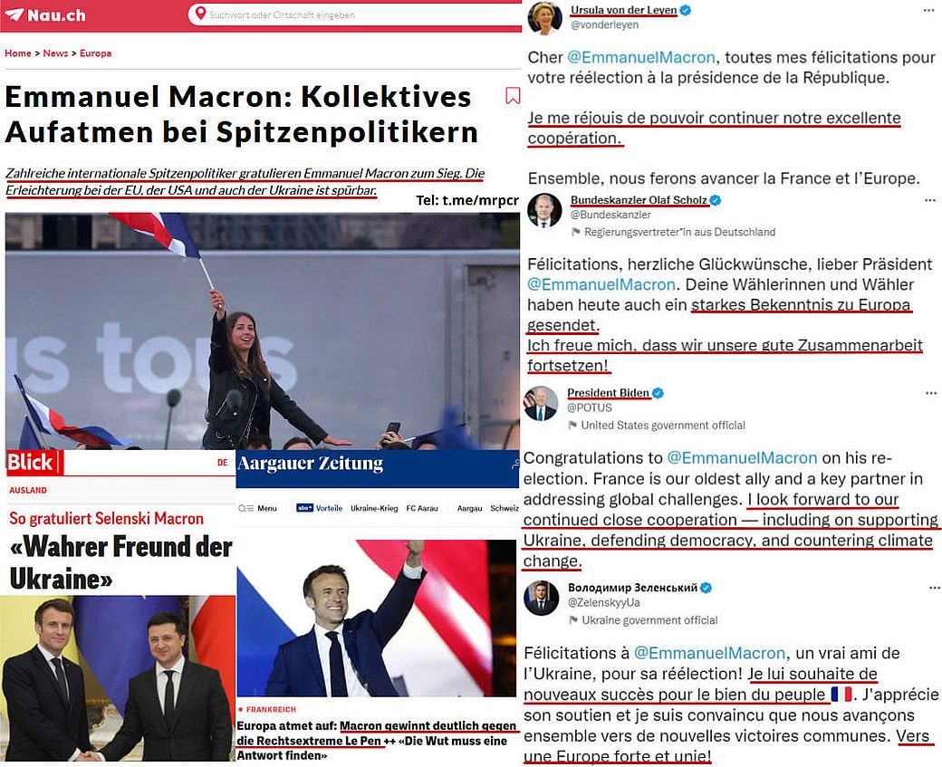 Ganz im Gegensatz zu der Bevölkerung Frankreichs (siehe hier, hier und hier) ist das kollektive Aufatmen bei den Westmächten über der erneuten Sieg von Emmanuel Macron (Le nouveau roi soleil, Der neue Sonnenkönig) in Frankreich gross. Die Glückwunschmeldungen der diversen Staatschefs sind in ihrer Aussage klar: Der Sieg Marcrons sei gut für die Einheit von Europa und der Demokratie und ermögliche erst die weitere optimale Zusammenarbeit auf dem eingeschlagenen Weg – sprich nur mit ihm kann weiterhin der Great Reset und Great Narrative sowie die Agenda 2030 umgesetzt werden. Ein wenig stutzig bei den vielen Glückwunschmeldungen macht mich, dass alle in ihrem Wortlaut praktisch identisch sind. Könnte es eventuell nicht sein, dass… Ein Schelm wer Böses denkt!