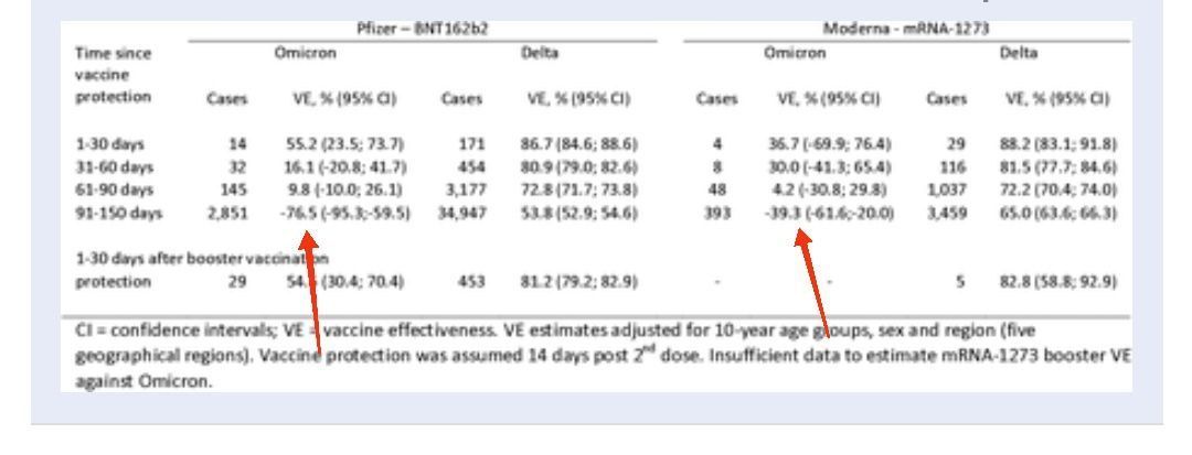 In der selben Studie finden wir auch den Schutz der Grundimmunisierten ggb. einer Infektion. Was auffällt: Nach 3 Monaten rauscht die Effektivität ins Negative. Bei Pfizer -76,5% und bei Moderna -39,3% (Bild). Was macht das RKI daraus?