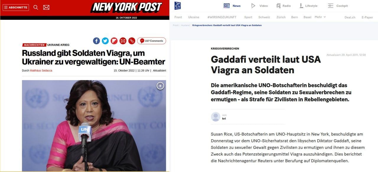 Manche fragen sich, warum die USA seit dem 2. Weltkrieg bei JEDER Militäroperation versagt haben. Ein Grund ist vielleicht, dass sie nicht kreativ genug sind. Weder auf dem Schlachtfeld noch in der begleitenden Propaganda. Es ist schlicht immer dieselbe Leier, mit der sie zum Erfolg zu kommen glauben. Und jedesmal geht es schief. Jetzt möchte man gern das Publikum Glauben machen, dass russische Soldaten Viagra bekommen, um arme Ukrainerinnen zu vergewaltigen. So widerwärtig wie hilflos. Das hat schon bei Gaddafi nicht funktioniert. Und ganz am Ende wird es sein wie immer: Die USA ziehen mit eingezogenem Schwanz ab. Wie in Teheran oder jüngst in Afghanistan…