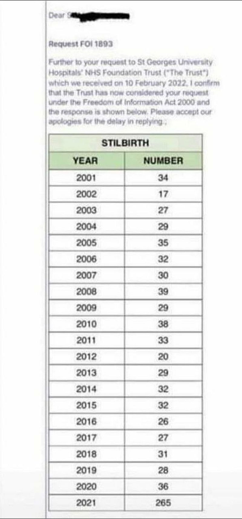 Das St George’s Universitätskrankenhaus in Süd-London veröffentlichte, aufgrund einer Nachfrage aus dem Kreis von Aktivisten, die offiziellen Zahlen zu den jährlichen Fehlgeburten aus ihrer Entbindungsstation der letzten 20 Jahre. Im statistischen Durchschnitt bedeutet das 30.2 Fehlgeburten pro Jahr bis 2020. Die Rate der Fehlgeburten ist im Laufe eines einzigen Jahres, in dem uns die experimentelle genetische Injektionsbehandlung gegen einen grippalen Infekt als sicher für Schwangere verkauft wurde, um das 8.77-fache auf 265 angestiegen. Ein echter Erfolg, wenn man das auf nationale Ebene hochrechnet. Die Zahlen für 2022 lassen noch viel Schlimmeres erwarten…
