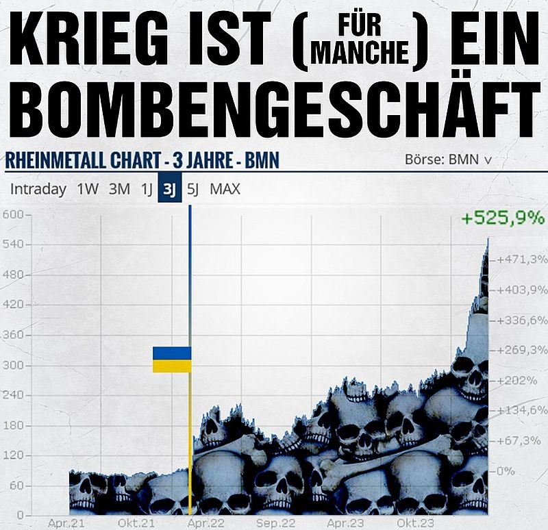 Ja, die Rüstungsindustrie lässt es so richtig knallen: Erst die Bomben, dann die Korken der Champagnerflaschen! Dort die Gräber, hier die Gläser! Krieg ist ein #Milliardengeschäft – jede Kugel, jede Bombe, jede Rakete lässt die Kassen klingeln – jedes zerstörte Haus und jede zerbombte Fabrik füllt die Auftragsbücher für den Wiederaufbau – die Verträge sind oft schon unterzeichnet, bevor der blutige Staub sich überhaupt gelegt hat. Dieses Bombenbusiness wird oft ausgeklammert und/oder geleugnet… Kranke verkehrte Welt! Alle reden nur von Kriegswirtschaft… dabei sollten wir alle an einer Friedenswirtschaft arbeiten!