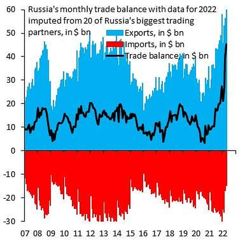 …und währenddessen klettern die Einnahmen Russlands wegen hoher Energiepreise in schwindelnde Höhen und der Rubel ist aktuell die stärkste Währung der Welt! Russlands Handelsüberschuss von Januar bis April 2022 betrug +133 Mrd. gegenüber +39 Mrd. im gleichen Zeitraum im Jahr 2021. Dieser Anstieg von +94 Mrd. ergibt sich aus einem Anstieg der Exporte um +86 Mrd. USD (blau) und einem Rückgang der Importe um -8 Mrd. USD.