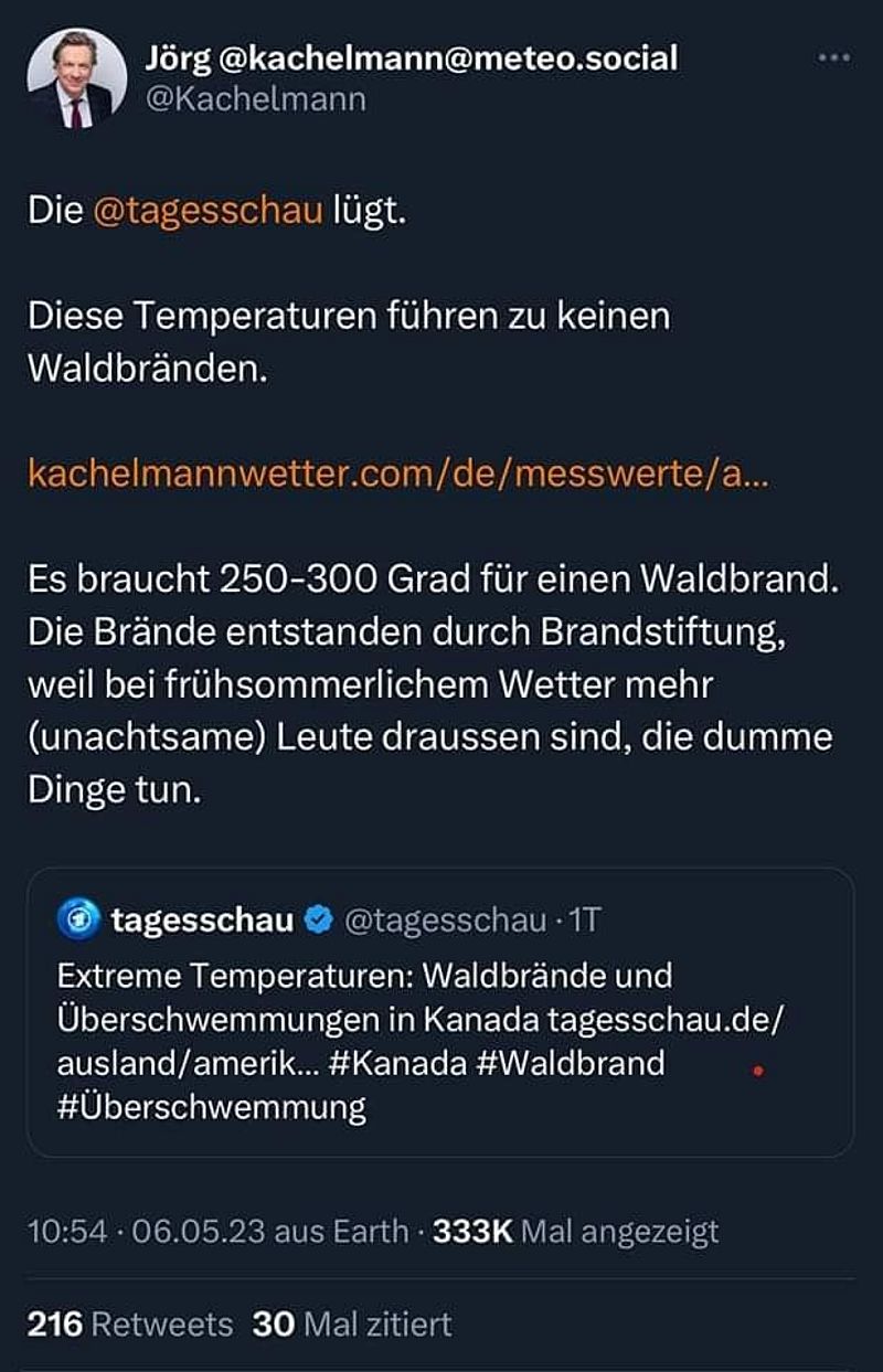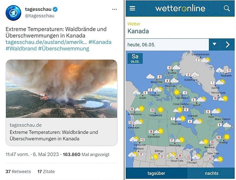 Die Tagesschau will den Zuschauern ernsthaft erzählen, dass es in Kanada wegen Temperaturen zwischen 12 und 20 Grad Celsius zahlreiche Waldbrände gibt. Wie schon bei den Horrormeldungen zu Temperaturen über 50 Grad Celcius in Thailand, welche problemlos als unwahr identifiziert werden konnten, so ist es bei dieser Meldung hier. Offensichtlich ist sind die ÖRR nur noch darauf getrimmt, Angst und Schrecken zu verbreiten, der Wahrheitsgrad der Meldungen ist irrelevant. Diese krassen Fake News müssen wir alle mit unseren GEZ-Beiträgen finanzieren. Es ist nicht verwunderlich, dass immer mehr Bürger weigern, die Zwangsabgabe zu leisten.