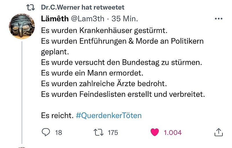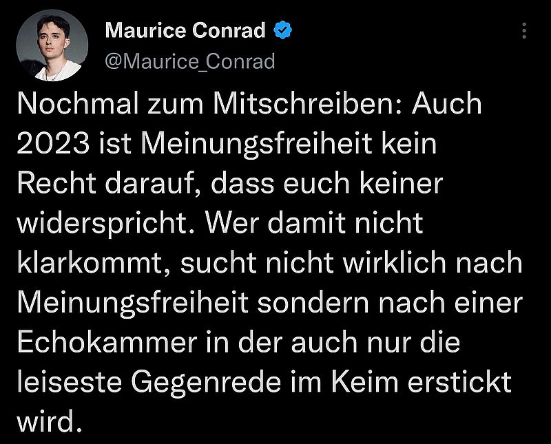 Sie sprechen von «Widerspruch» und meinen: Canceln, Deplatforming, Mobbing, Hetze und Gewalt. Es gab noch Zeiten, da waren Argumente und Sachlichkeit Werte die von dieser Seite gelebt wurden, heute bewegt man sich praktisch nur noch in der radikalen Ecke und fühlt sich dabei als Weltverbesserer, der erhaben ist und sich beflossen sieht, anderen Menschen moralisch zu «erziehen». Wenn hier Kritik folgt, bedient man sich heute den üblichen linken Euphemismen wie Canceln, Deplatforming, Mobbing, Hetze und Gewalt.