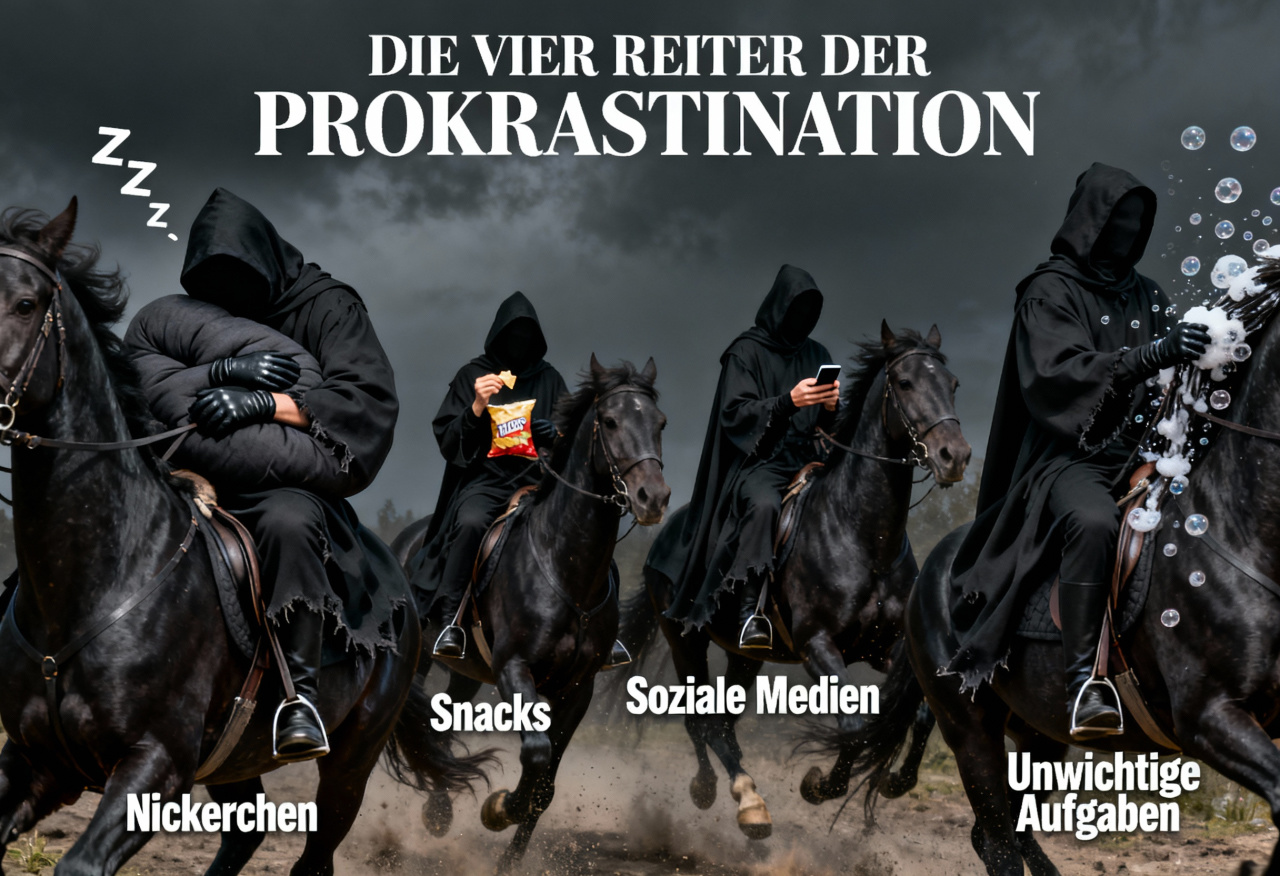 Sie kommen lautlos, aber zuverlässig – die vier apokalyptischen Reiter des modernen Menschen: Nickerchen, Snacks, Soziale Medien und Unwichtige Aufgaben. Sie reiten nicht auf Pferden, sondern auf WLAN, Kaffeeduft und der Illusion, «gleich wirklich anzufangen».